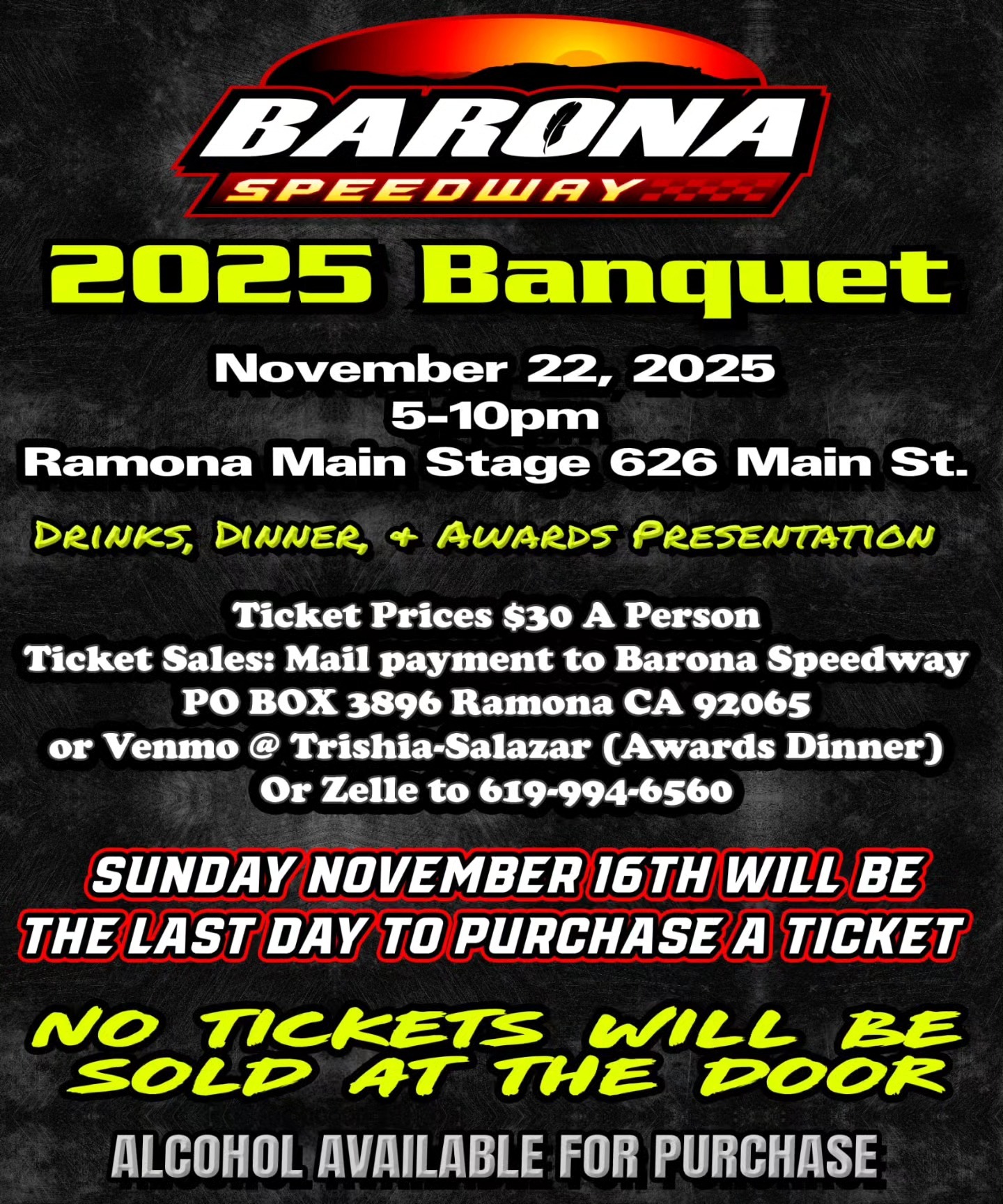 The promoters of Barona Speedway continue to make every effort to assure your family’s visit will be as enjoyable as possible. There is a third party concession stand for your convenience, with lots of good food and soft drinks, or you may bring your own cooler and BBQ’s.